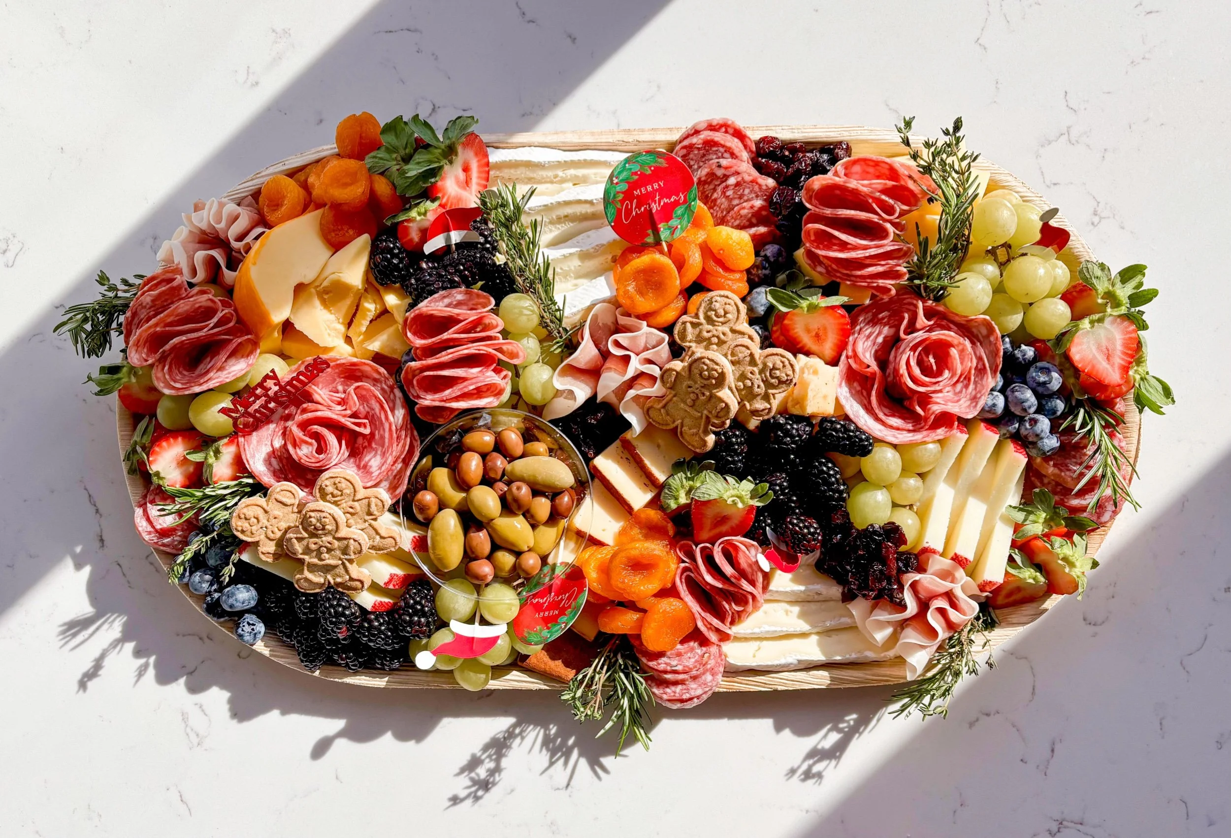 4 meats, 5 cheeses, fruits, nuts, jams, etc. Perfect for 8-10 as an appetizer or 6-8 as a meal. COMES WITH ONE SLEEVE OF CRACKERS.