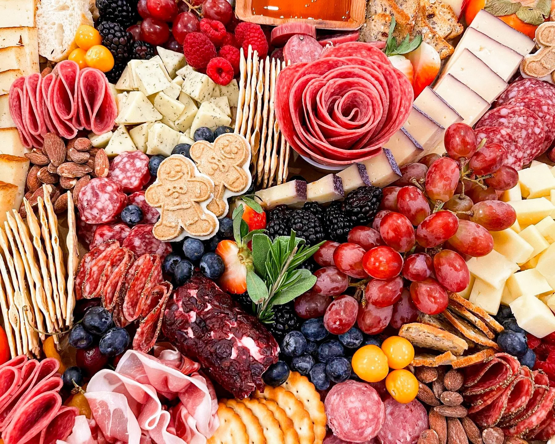 2 meats, 3 cheeses, fruits, nuts, jam, and other grazing items. Perfect for 4-6 as an appetizer or 2-3 as a meal. COMES WITH ONE SLEEVE OF CRACKERS.